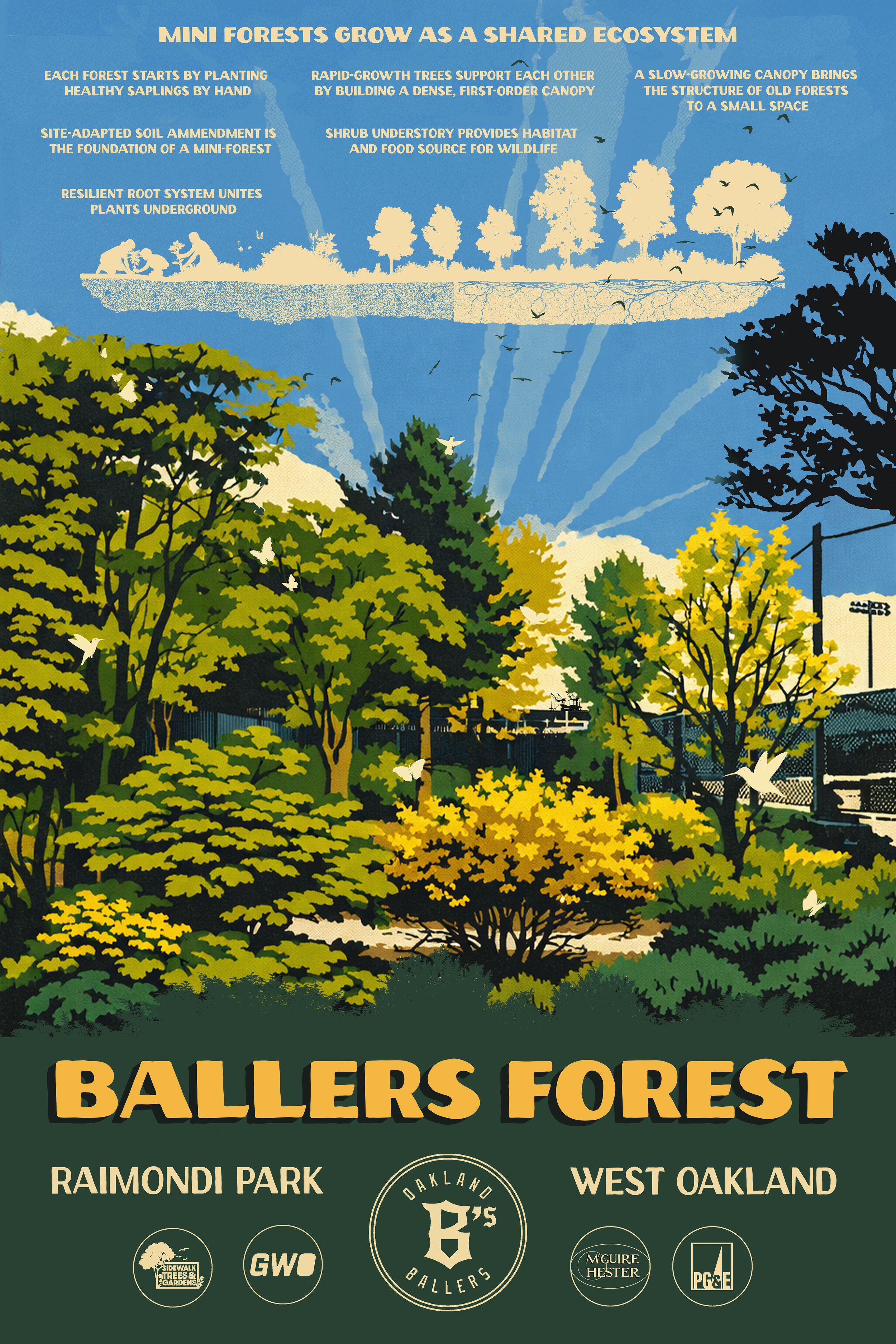 In partnership with the Oakland Ballers, PG&E, McGuire & Hester, and Groundworks Office Landscape Architects, we planted Oakland’s first mini-forest following the Miyawaki method. The resulting self-sustaining woodland is designed to improve air quality, cool neighborhood temperatures and provide habitat for birds and pollinators. We are incredibly proud of this innovative project and the strong partnerships with organizations that prioritize taking care of our shared environment.